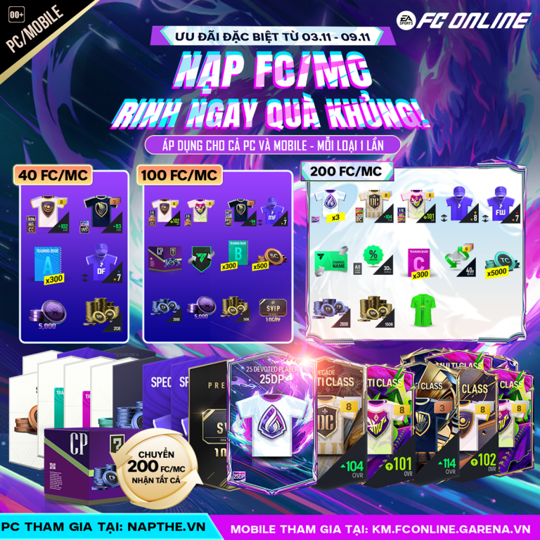 Khi đạt mốc 200 FC/MC, các HLV sẽ nhận được các siêu sao mùa 25DP mới nhất với 3 Gói 25DP All hay các siêu phẩm mạ vàng tại Gói DC, JNM, 23HW 104+ (6~8), Gói HW, HG, LN 101+ (+8),...Chi tiết xem tại đây