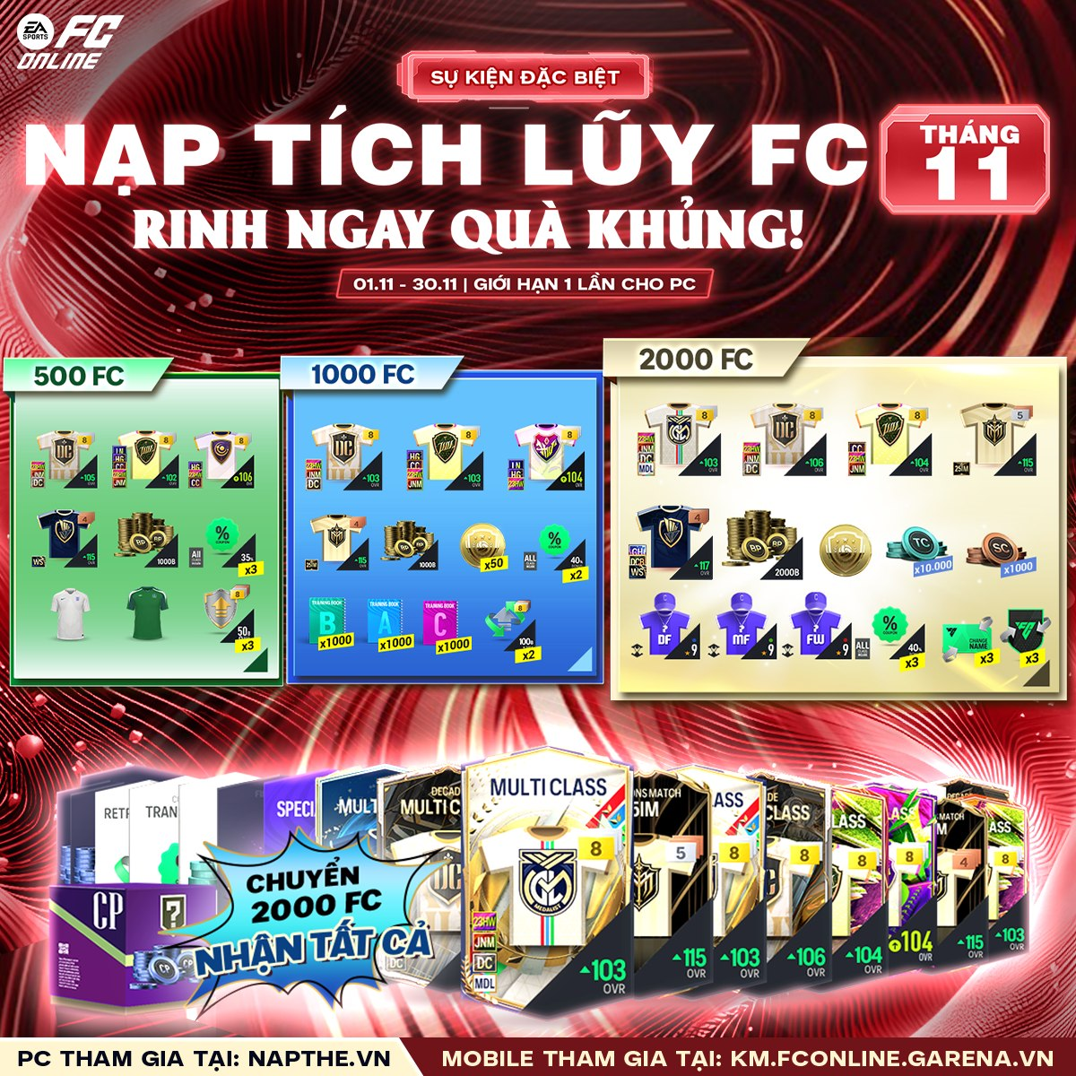 Tại sự kiện tích lũy tháng 11, khi tích đủ 2000 FC, các HLV sẽ có cơ hội sở hữu các siêu sao mạ vàng tại các mùa thẻ quốc dân hiện nay trải đều cả 3 mốc tại các Gói MDL, DC, JNM, HW 103+ (6~8), Gói DC, JNM, 23HW, CC 106+ (7~8), Gói DC, JNM, 23HW 103+ (+8),... Chi tiết xem tại đây