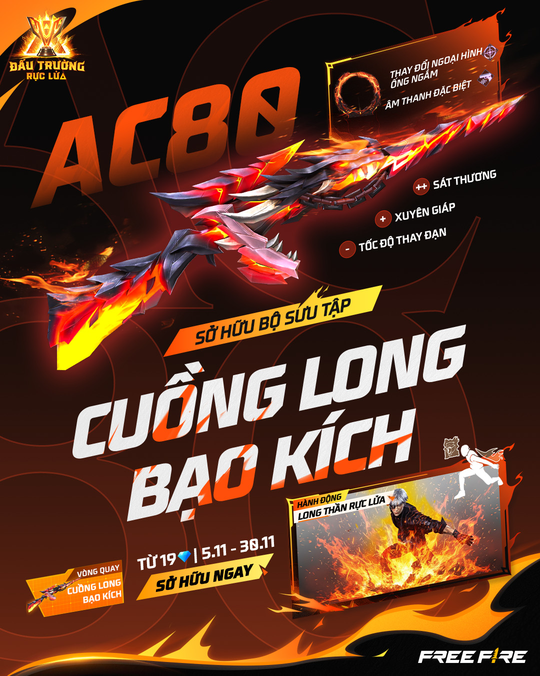 Sở hữu ngay AC80 Cuồng Long Bạo Kích với chỉ số Sát Thương cực khủng cùng hành động Long Thần Rực Lửa đẹp mắt chỉ từ 19KC. Chi tiết xem tại đây