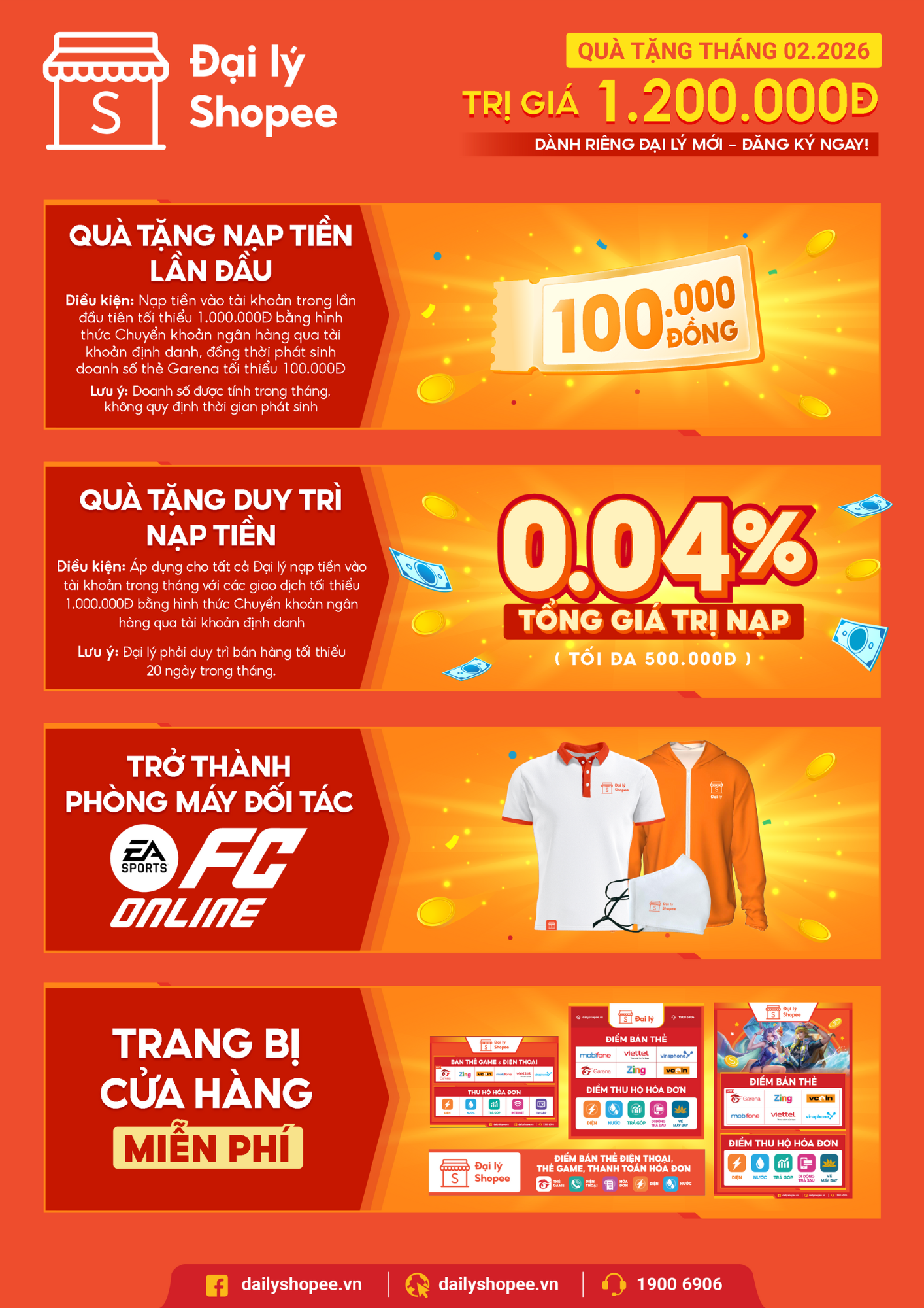 >>> QUÀ TẶNG NẠP TIỀN LẦN ĐẦU <<<Dành cho tất cả khách hàng đăng ký tài khoản Đại lý Shopee trực tuyến thông qua https://web.dailyshopee.vn/login hoặc ứng dụng Đại lý Shopee thành công trong tháng. Xem hướng dẫn đăng ký tại đây