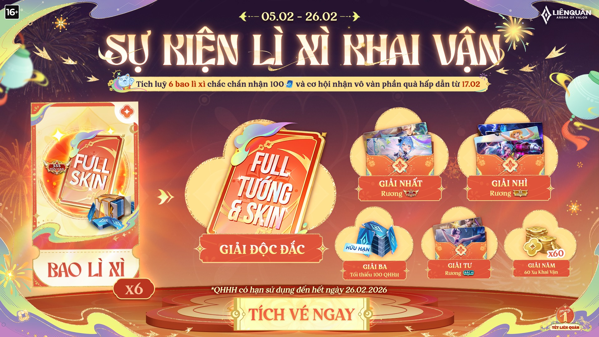 Tết đến xuân sang, lộc tràn khắp lối! Sự kiện Lì Xì Khai Vận chuẩn bị khởi động, mang đến cơ hội mở kho quà Tết cực xịn sò cho các kiện tướng đây! Chi tiết xem tại đây