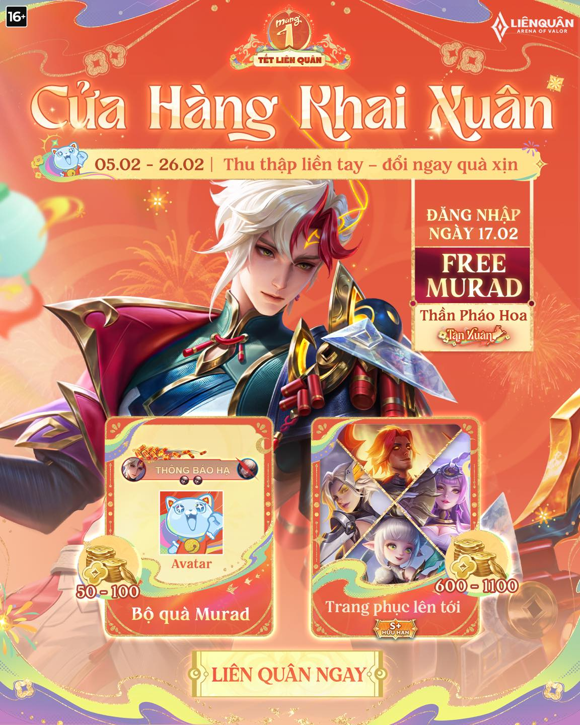 Đăng nhập Mùng 1 Tết - 17.02 - Nhận ngay trang phục Tân Xuân Murad - Thần Pháo Hoa. Từ ngày 05.02 - 26.02, tích lũy xu Khai vận để đổi các phần quà lên tới trang phục S+ hữu hạn. Chi tiết xem tại đây