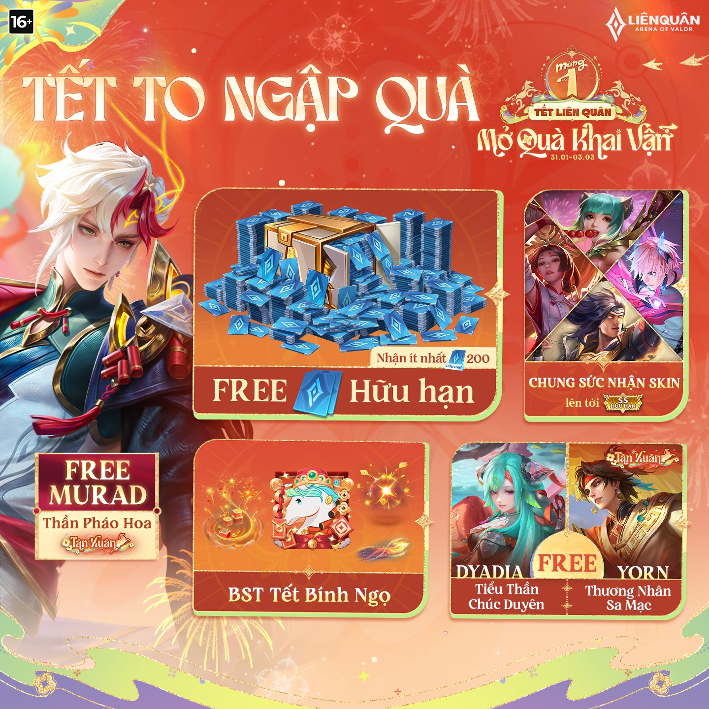 Chuỗi sự kiện Tết Liên Quân - Mở Quà, Khai Vận cùng rất nhiều các phần quà đang đón chờ bạn! Chi tiết xem tại đây