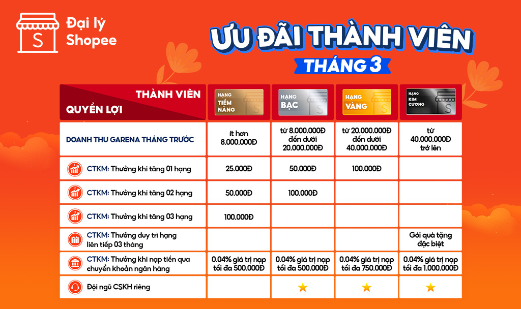 - Đại lý Shopee khuyến khích quý Đại lý thường xuyên theo dõi trang chủ để cập nhật các thông tin ưu đãi dành cho thành viên.