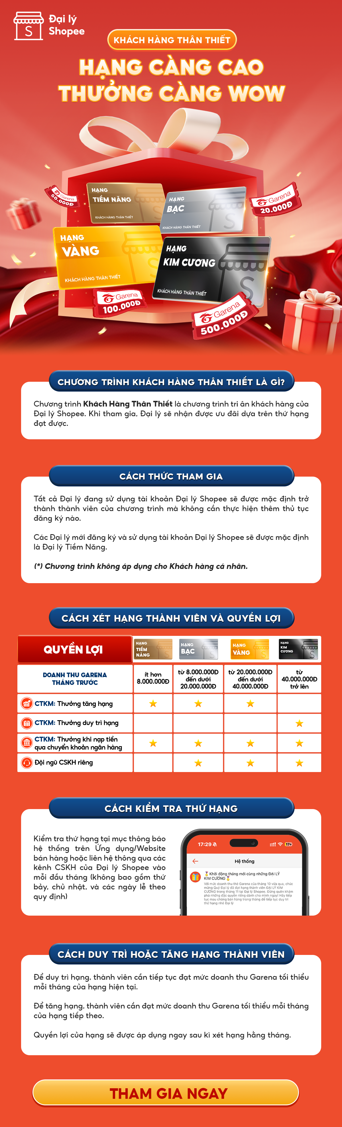 Với chương trình Khách Hàng Thân Thiết, quý Đại lý khi thực hiện thanh toán trên nền tảng Đại lý Shopee sẽ có cơ hội nhận thêm nhiều phần thưởng và ưu đãi độc quyền mỗi tháng chỉ dành riêng cho thành viên.